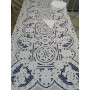Ricamo a mano: intaglio e punto pieno presenti in continuità su piano tavola e calata.